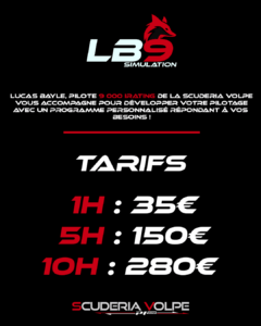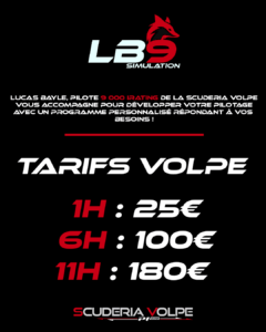 Et si vous faisiez partie de la Scuderia Volpe ? En effet, prendre du coaching avec Lucas Bayle et intégrer notre structure vous donnera accès à des tarifs préférentiels ! Alors n’hésitez plus et rejoignez-nous en postant votre candidature ici !